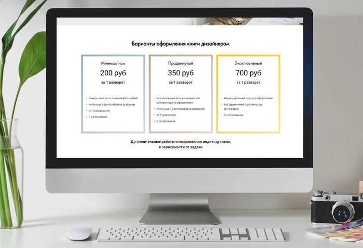 При создании фотокниг у каждого автора есть определенные потребности и задумки. Кто-то любит простой дизайн, единый фон на всю книгу и минимум текста. А кто-то хочет более сложное оформление книги, с использованием различных масок, логотипов, персональных фонов, эффектов, ретуши т .д. Верстка двух этих книг не сравнима по трудозатратам и времени, а значит не может оцениваться одинаково. Для этого мы создали три варианта оформления книги с дизайнером - “Минимализм”, “Продвинутый” и “Эксклюзивный. Каждый из них включает в себя не только принцип оформления, но и кол-во фотографий, согласований и разворотов. Это важно учитывать, т.к. даже если вы хотите создать книгу в стиле Минимализм, но предпочитайте делать много правок и менять макет в процессе создания, то вам скорее подойдет вариант “Продвинутый”.