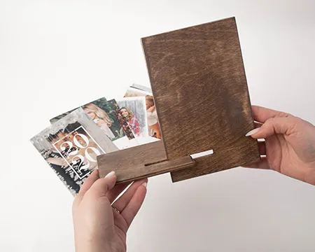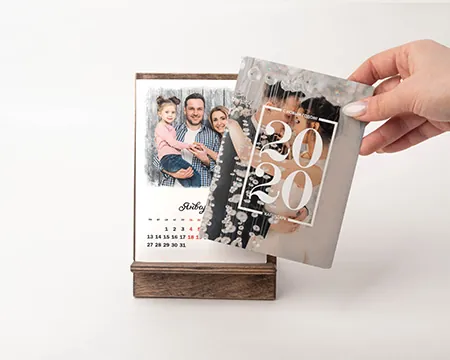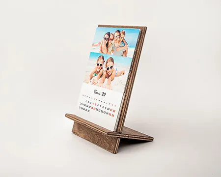 Настольный фотокалендарь - известный и популярный подарок на Новый год. Альбомикс предлагает три варианта традиционных классических настольных календаря -“домика”. Но что если совместить фоторамку и настольный фотокалендарь вместе? Правильно, получится настольный календарь на подставке! Для создания подставки мы использовали природный материал - дерево. Чтобы не покрывать их морилкой и не красить, а оставить естественный цвет в качестве материала был выбран благородный дуб.