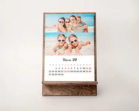 Итак, настольный фотокалендарь на подставке состоит из обложки плюс 12 карточек месяцев. В верхней части каждой карточки вы можете разместить одну или несколько фотографий, обработать их, сделать подписи, применить маски или добавить декора, а нижняя часть карточки месяца представляет из себя дизайнерскую лаконичную календарную сетку, которая отлично сочетается с размещенными фотографиями. Вдобавок, чтобы было удобнее пользоваться календарем, мы добавили еще один лист на полный следующий год. Карточки календаря на подставке из дерева напечатаны на плотной бумаге полиграфическим способом на профессиональном печатном оборудовании.